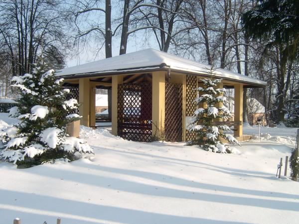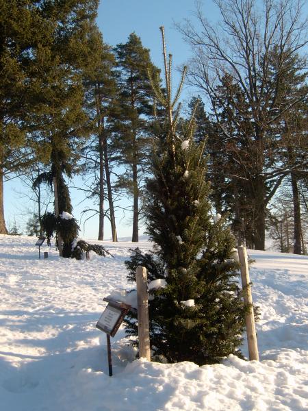 Jedle (Abies), skupina horní park, v pozadí památná lípa (Tilia) žampašská, zima 2006