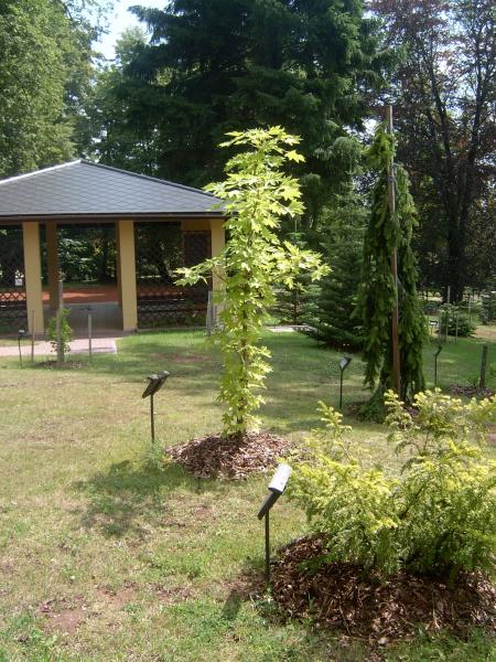 Javor klen - pestrolistý Acer pseudoplatanus ´Leopoldii´ mladý stromek v horním parku 2005