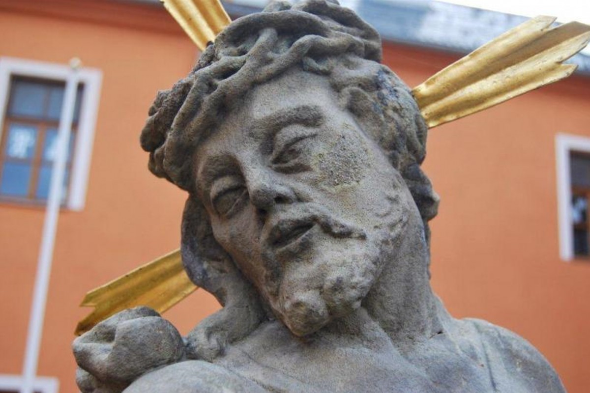 Barokní pískovcová socha Bolestného Krista - Ecce homo neznámého autora z roku 1758. Kulturní památka rej. č. 3894.
