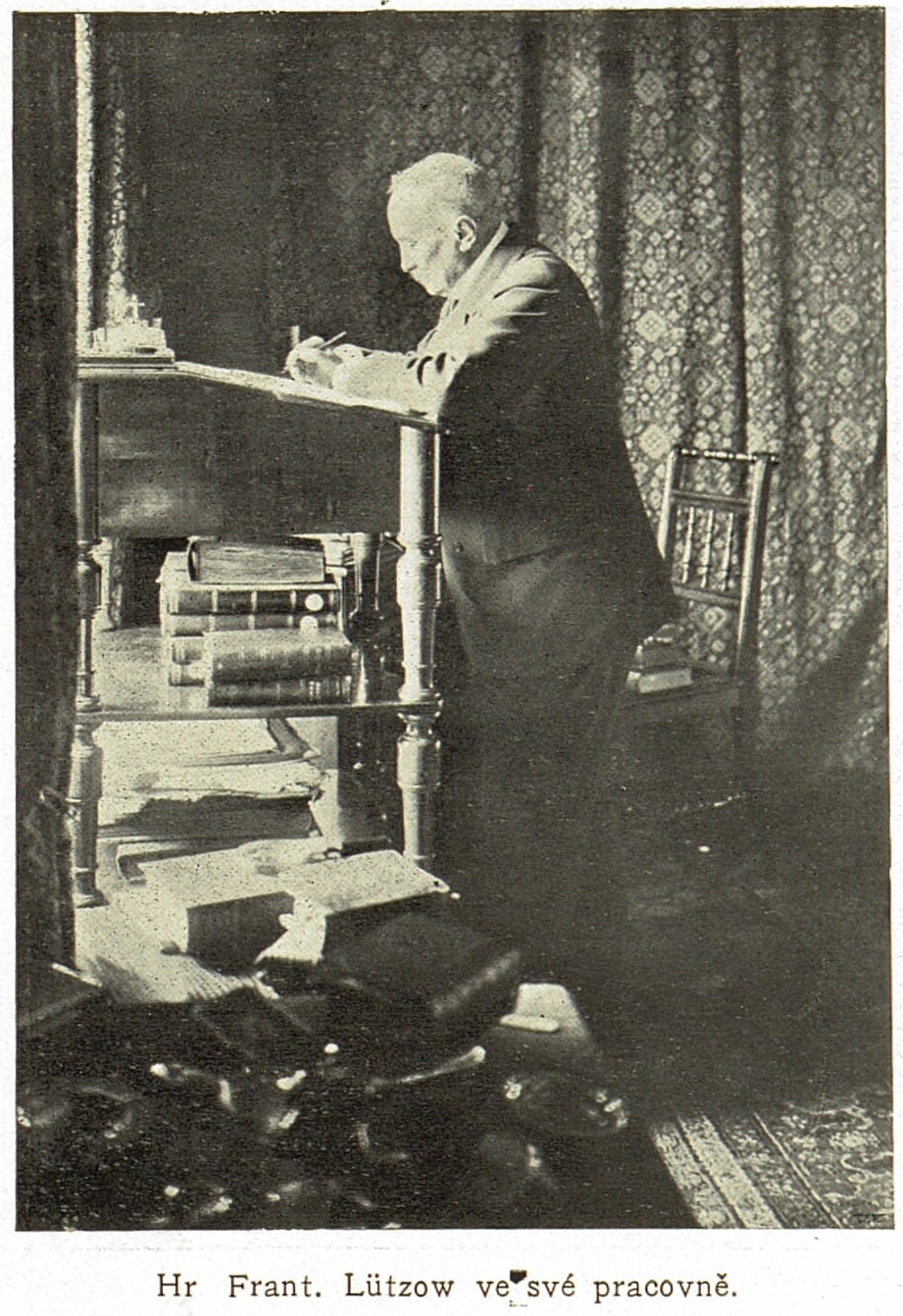 Dr. František hrabě Lützow se narodil 21.3.1849 v Hamburgu. V letech 1867 - 71 studoval práva na vídeňské a insbrucké univerzitě, r. 1873 - 81 působil jako rakousko - uherský diplomat v Římě a Londýně a od roku 1885 byl poslancem říšského sněmu ve Vídni.V roce 1889 se vzdává svého mandátu a věnuje se soukromému studiu české historie a literatury , vědecké práci a publikování. Stává se stoupencem českého historicko - státoprávního hnutí a propaguje českou kulturu zej. v Anglii a Americe.