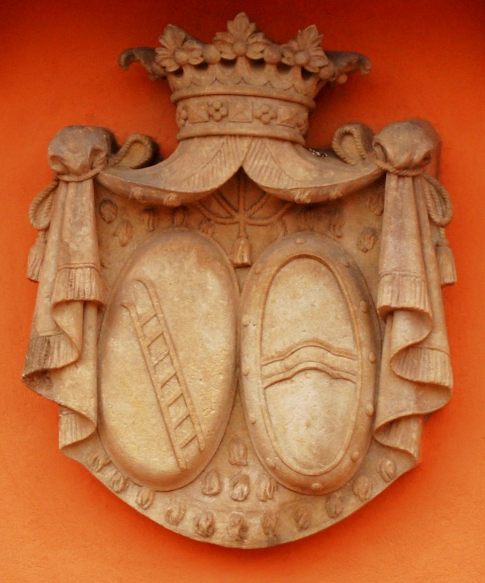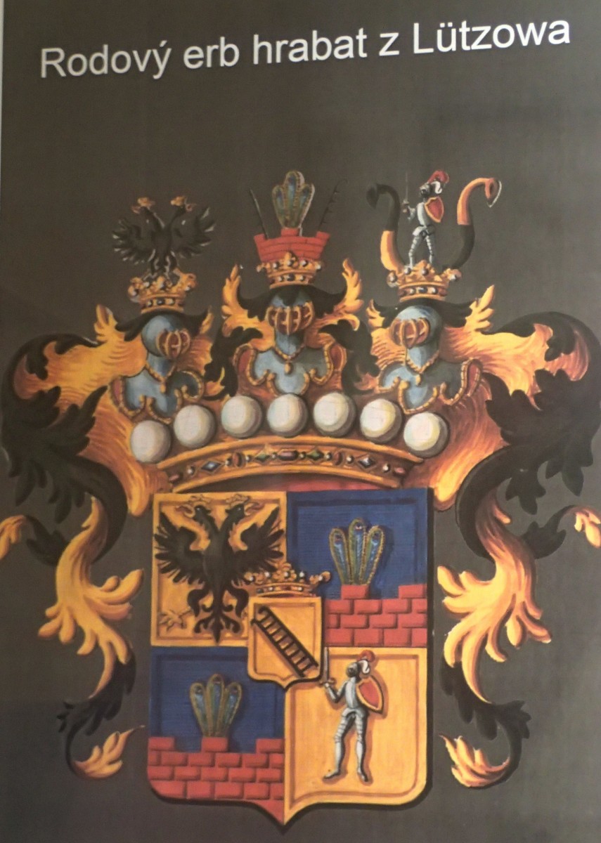 Rodinný erb je umístěn na severní nádvorní straně zámecké budovy na Žampachu. Hlavní ozdobou rodinného erbu manželů Lützowových na žampašském zámku je motiv královského hermelínového pláště vycházejícího z hodnostní hraběcí koruny s devíti viditelnými perlami. Plášť je vyvázán šňůrami se střapci. Toto erbovní pozadí pochází ze 17. století a bylo vymezeno knížatům a hrabatům. Erbovní znaky manželů Lützových jsou vloženy na tento plášť. Erbovním znamením německého hraběcího rodu von Lützow byl žebřík na žlutém štítu. Jedná se o znamení odpovídající obecné erbovní figuře z kategorie řemeslných výrobků.Vlastní rodový erb hrabat Lützowových byl ztvárněn v podobě čtvrceného erbu se třemi přilbami, s hlavním rodovým znakem (štít se žebříkem) vloženým jako střední štítek.