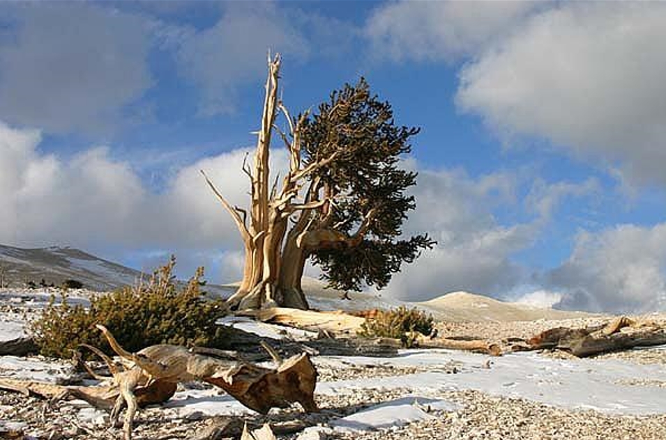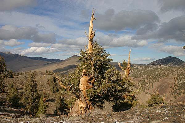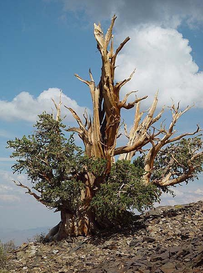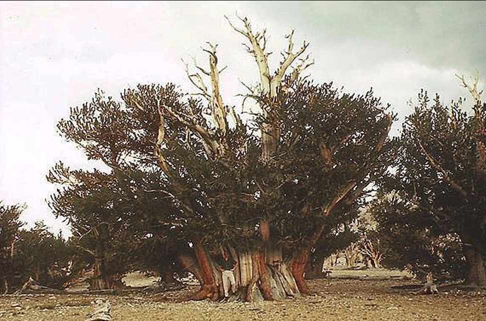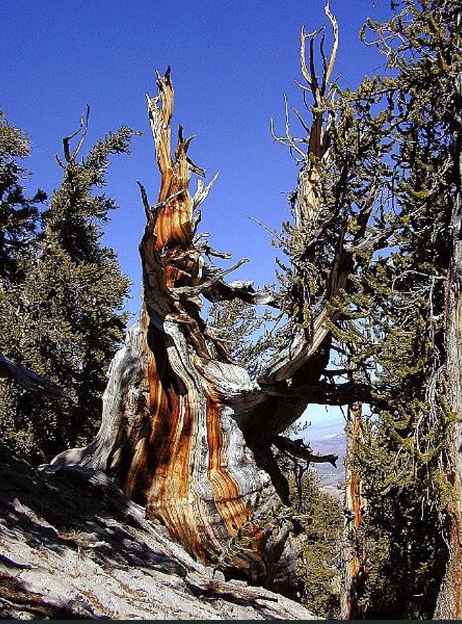 borovice osinatá - P. aristata´Engelmann´,Syn Pinus longaeva - the White Mountains of California, jedinec zvaný ´Methuselah´ , stáří 4.789 roků, výška 12.5 m a obvod kmene 11 m