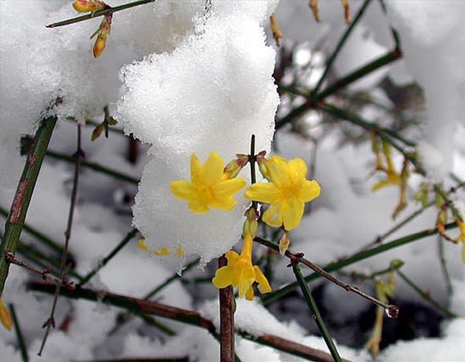 Listy má drobné, 1-3 cm dlouhé, trojčetné, vstřícně postavené. Trubkovité pětičetné květy jsou jasně žluté, vyrůstají na loňských větévkách od prosince do dubna. Jedná se tedy o další, v našem areálu v zimě kvetoucí, dřevinu.