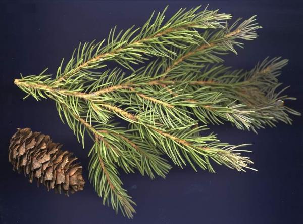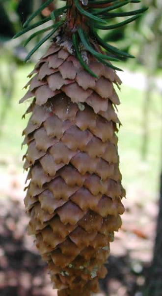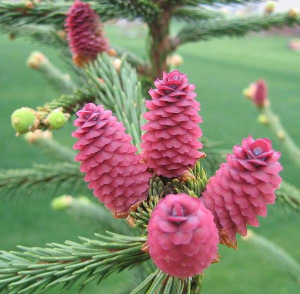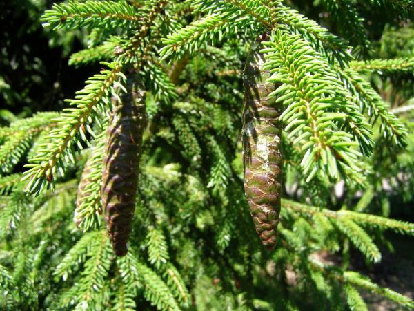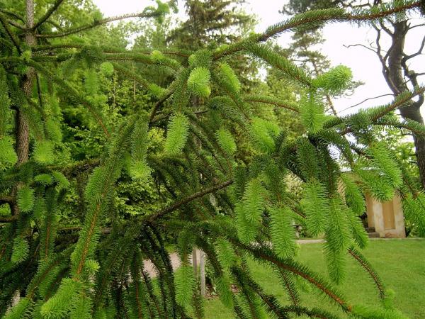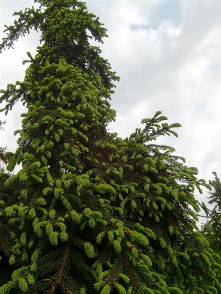 Dále lze v našem parku shlédnout exempláře krásného smrku východního (Picea orientalis), který pochází z Malé Asie (v kultuře zaveden od r.1837), včetně kultivaru ´Aurea´, jež má zejména při rašení zlatožlutě zbarvené špičky jehlic. Tento smrk dosahuje výšky 30 m, jeho habitus je velmi jemný, což způsobují jeho krátké (6-8 x 1 mm) jehlice, které jsou tupé a na větvičce velmi hustě nahloučené. K drobným jehlicím ladí i poměrně drobné (5-9 x 2 cm) šištice. V našich podmínkách má význam i díky své odolnosti vůči suchu.
