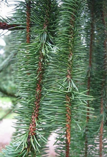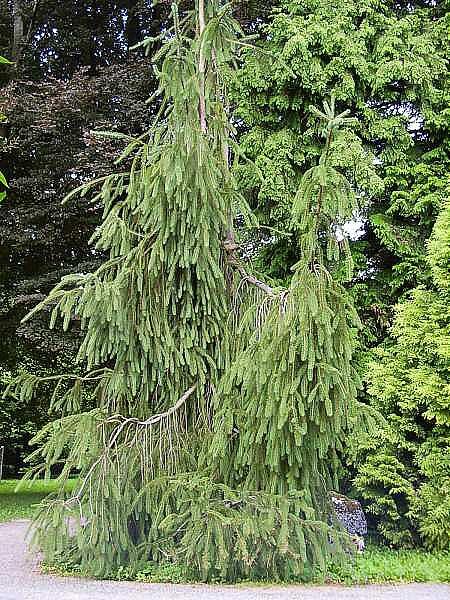 Smrk ztepilý, obecný (Picea abies, excelsa) je schopen dorůst výšky 50 až 70 m a průměru kmene až 2 m a je tak nejvyšším domácím stromem v Evropě. Dožívá se i přes 500 let. Původně se vyskytoval pouze v horských a podhorských oblastech, dnes ho nacházíme i v nižších polohách, kam byl vysazován díky své velmi rychlé produkci dřevní hmoty. Vyžaduje však vláhu a čisté ovzduší. Jeho habitus je lehce závojovitý, protáhle přišpičatělé jehlice (10-25 mm dlouhé) vytrvávají kolem 8 let. Válcovité šištice (8-16 x 3-4 cm) mají tuhé plodní šupiny. Právě z tohoto druhu je vyšlechtěno nejvíce okrasných kultivarů lišících se zejména habitem a barvou jehlic. Ve zdejším parku patří k nejzajímavějším zejména kultivar ´Acrocona´, v dospělosti max. 5 m vysoký, který má všechny větve podél kmene často až k zemi splývající, ne však ke kmeni přitisklé, s monstrózními šišticemi na koncích výhonů.Podobný charakter růstu má i 5-10 m dorůstající kultivar ´Inversa´, jehož taktéž podél kmene splývající větve jsou však ke kmeni výrazně přitisklé. Poněkud nepravidelnou korunu s různě dlouhými větvemi v obloucích převisajícími má až 10 m dorůstající kultivar s krátkými jehlicemi ´Rothenhaus´. Ozdobou parku jsou i kultivary tzv. „hadích smrků“ ´Cranstonii´ a ´Virgata´, charakteristické řídkou korunou a hadovitě propletenými větvemi s na koncích větví nahloučenými větvičkami. Někdy je k hadím smrkům přiřazovaný kultivar ´Viminalis´, který má základní větve i mírně vystoupavé, však dále málo rozvětvené a dlouze záclonovitě nící.