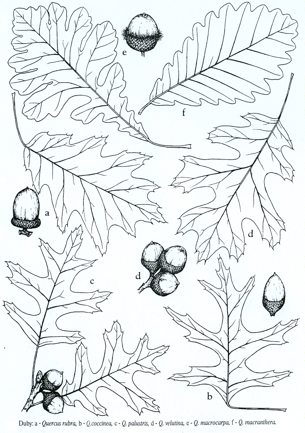 * duby s listy špičatě laločnatými (např. Q. coccinea, Q. palustris, Q. rubra)