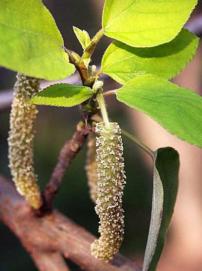 Velmi ozdobný je zejména svými široce vejčitými listy, 7 - 20 cm dlouhými, často 3 - 5 laločnými, především na mladých rostlinách, oboustranně chlupatými. Samčí a samičí květy jsou velmi rozdílné, samčí jehnědy dosahují 5 - 15 cm délky, samičí hlávky pouze 10 - 15 mm. Plody jsou oranžově červené kulovité hlávky o velikosti 2 - 3 cm, ze kterých vyčnívají červené plody.