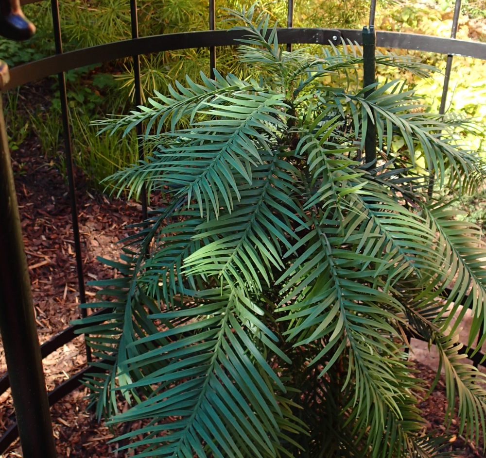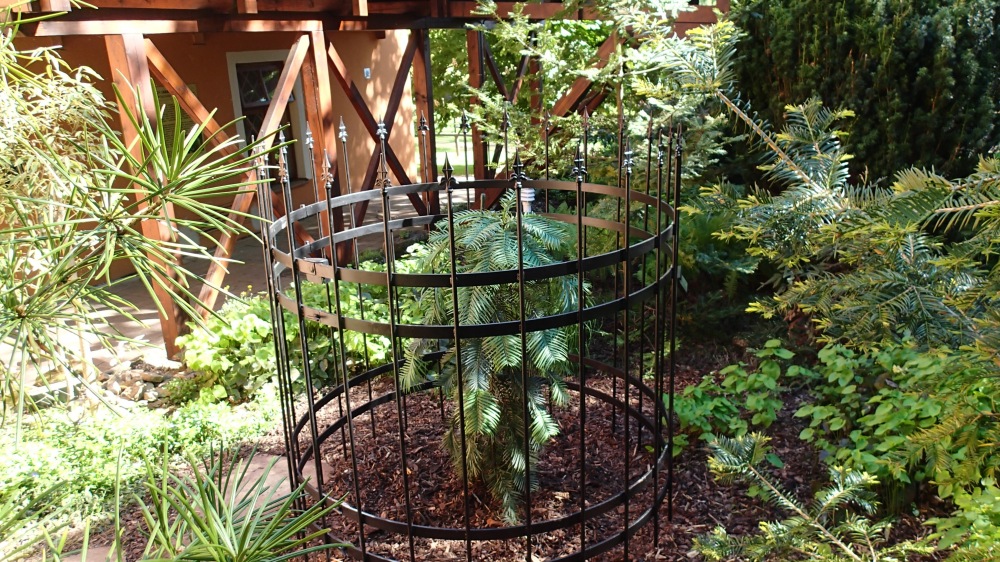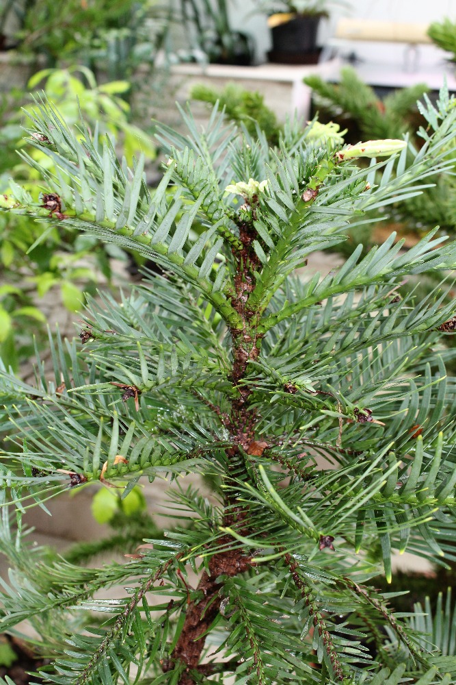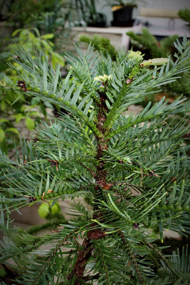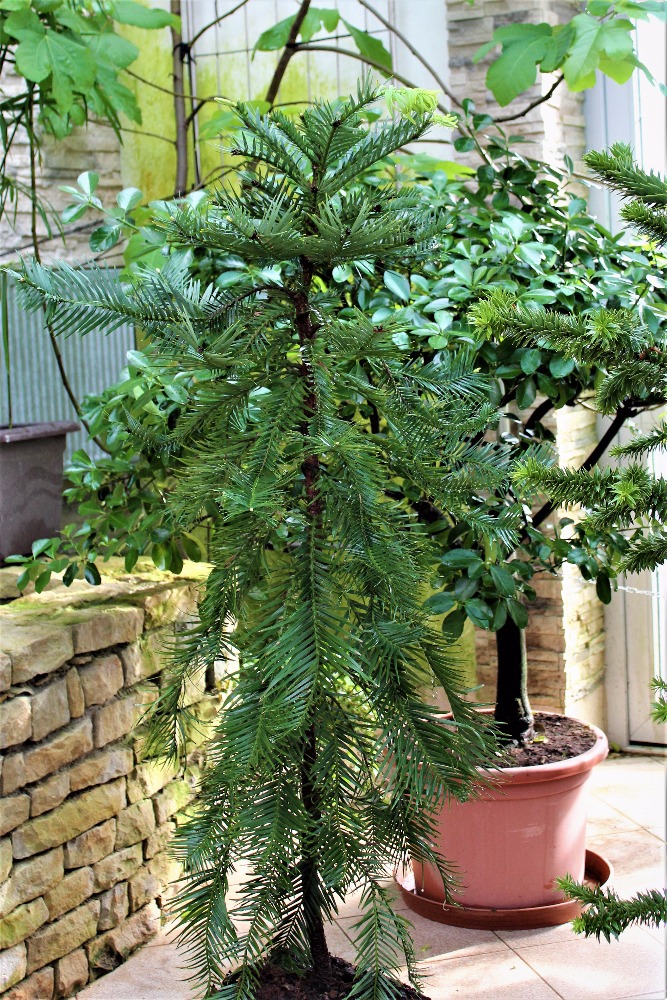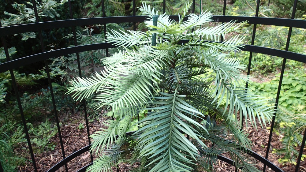 Wollemia nobilis - wollemie vznešená v Arboretu Žampach v roce 2017 - zimoviště: