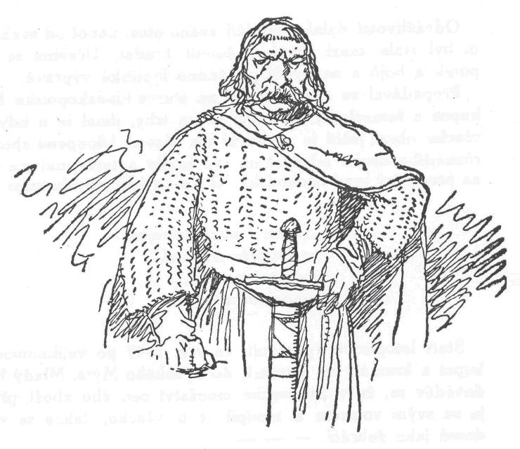 U jednoho stolu v rohu místnosti seděl mezi několika váženými sousedy a konšely zámecký purkrabí, pan Petr z Příčna a živě rozmlouval. Jeho šedivá brada se třepetala neustále.