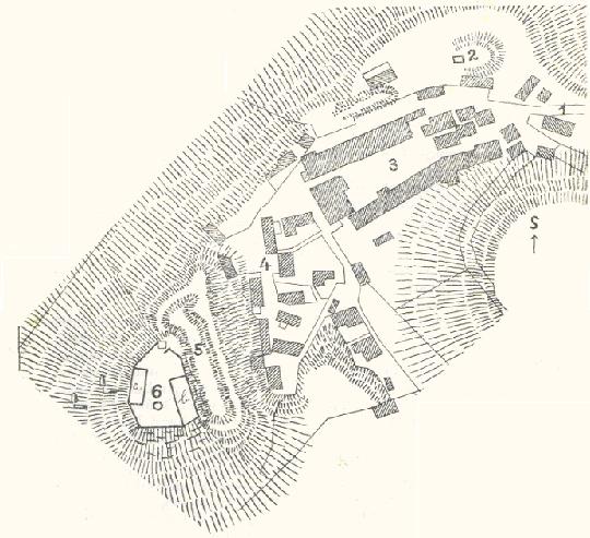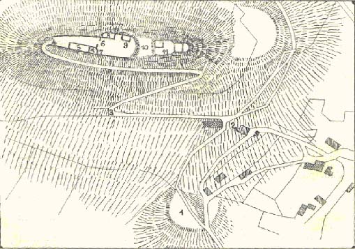 1. Původní, stará vozovácesta vede do předhradí apod baštou (2) nyní zde stojí kaplička. 3. býv. poplužní dvůr, nyní na množstvíchalup rozparcelovaný. 4.vesnička Budy, tato oddělena odhradupříkopem[mezi 4 a 5], 5. druhý příkop. 6.hlav.hrad. ?bránydohlav.hradu. ( studně, a] čelední místnosti, zbrojnice a pod. b] hlavní obytný palác.