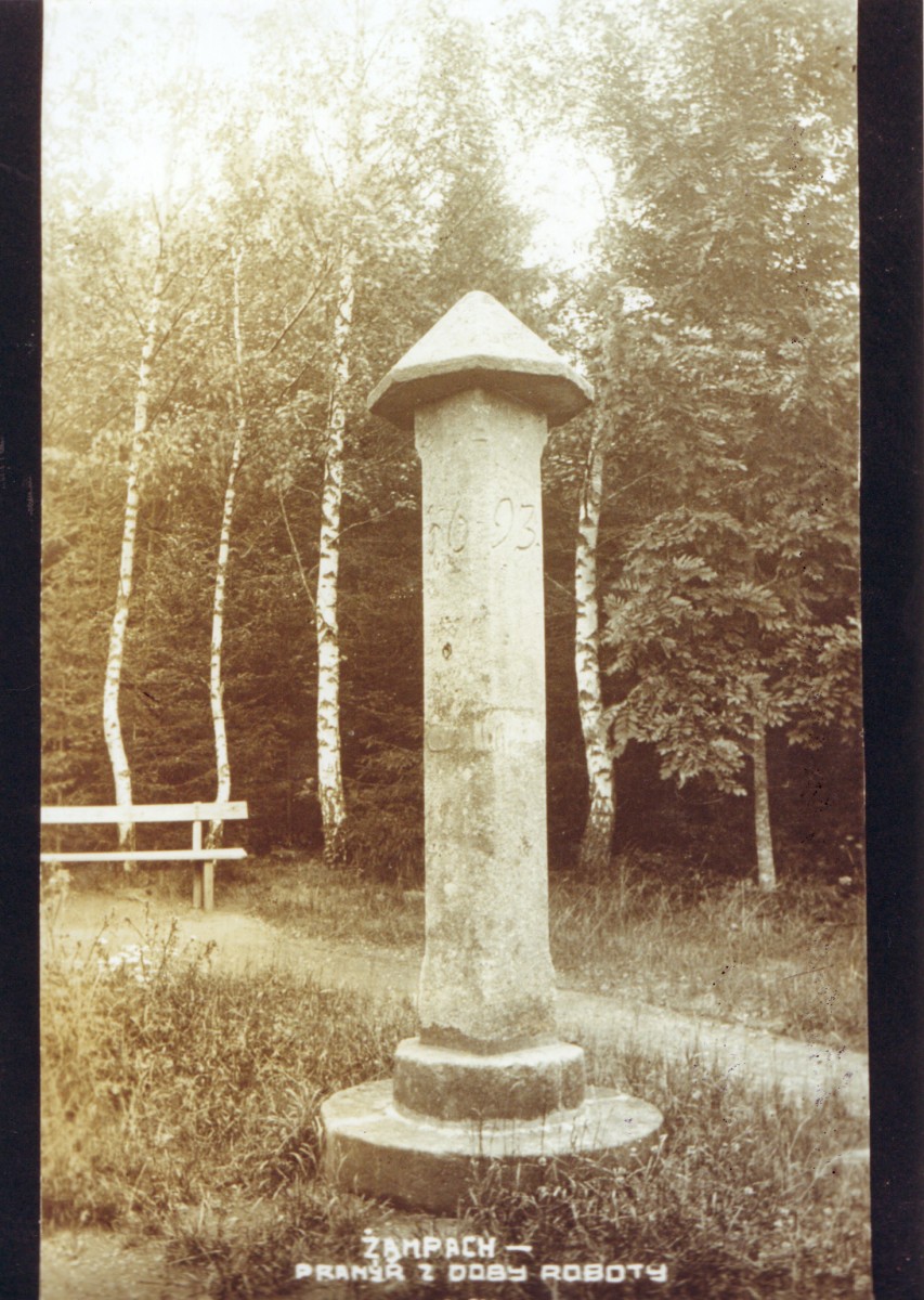 V místní kronice se dozvíme k této památce více: “Místní památností je na Žampachu pranýř s letopočtem 1693 a s původním kruhem, u něhož byli viníci přivazováni. Je-li pranýř vrchnostenský neb obecní, to se neví neb bližších zápisů o něm není. Tento pranýř stojí dnes již na třetím místě. Původně stál na obecní cestě do Hejnic. Poprve byl přemístěn velkostatkem v roce 1904. V roce 1920 přemístil jej velkostatek podruhé.“