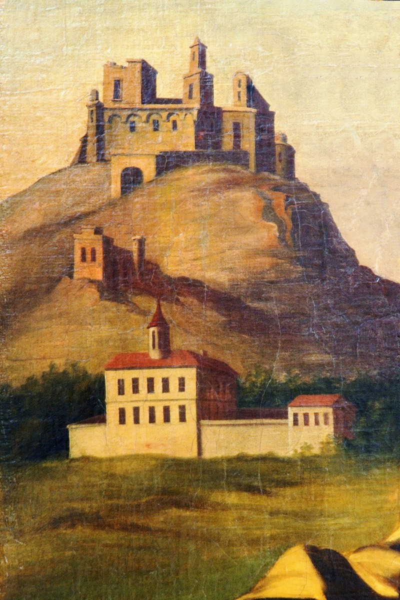 Výjev: Karel IV. na korunovační cestě r. 1355 vyznamenává Smanického za statečnost zlatým řetězem a pasuje ho na rytíře.