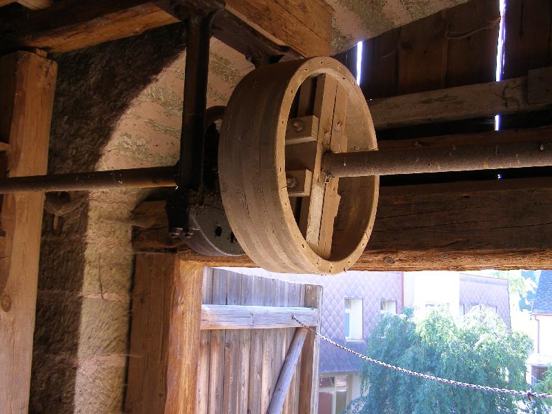Řemenice na této zdi je pozůstatkem zařízení na výrobu elektřiny pro potřebu osvětlení zámeckých místností. K výrobě elektřiny se tehdy používal např. Edisonův stroj dynamoelektrický (sestrojený r.1881), který byl zdrojem stejnosměrného proudu (120 V) založený na principu strojů válcových. Na tomto místě v přístavku u stodoly byl ještě před r. 1910 umístěn vlastní stroj na výrobu elektřiny pro zámek hnaný stabilním spalovacím motorem. Přes řemenici byl stroj využíván také k mechanickému pohonu dalších hospodářských strojů umístěných ve stodole. (Do té doby poháněných dobytčí silou ze žentouru před stodolou?)